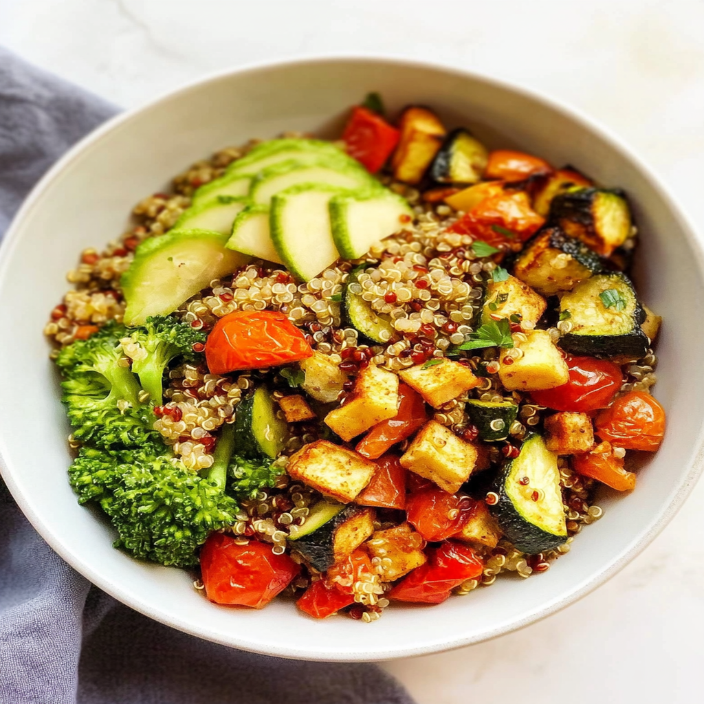 Delight in a colorful medley of roasted vegetables paired with fluffy quinoa, creating a nourishing and satisfying dish. Perfect for meal prep, this bowl bursts with flavors and can be customized with your favorite proteins or dressings. Enjoy a wholesome meal that not only pleases the palate but also fuels your body!