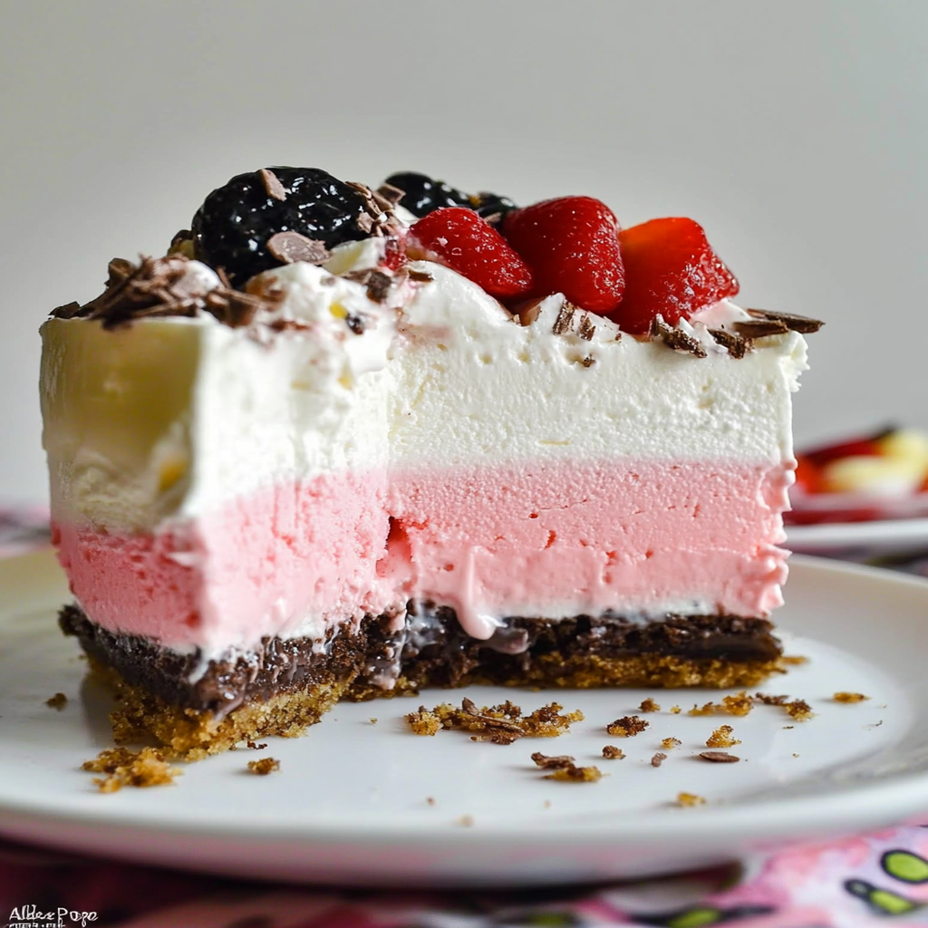 Neapolitan ice cream cake is a delightful fusion of rich chocolate, creamy vanilla, and fruity strawberry ice creams layered atop a crunchy cookie base. This colorful dessert is perfect for birthdays, summer gatherings, or simply indulging yourself. With its eye-catching presentation and a symphony of flavors, it’s sure to impress both family and friends.