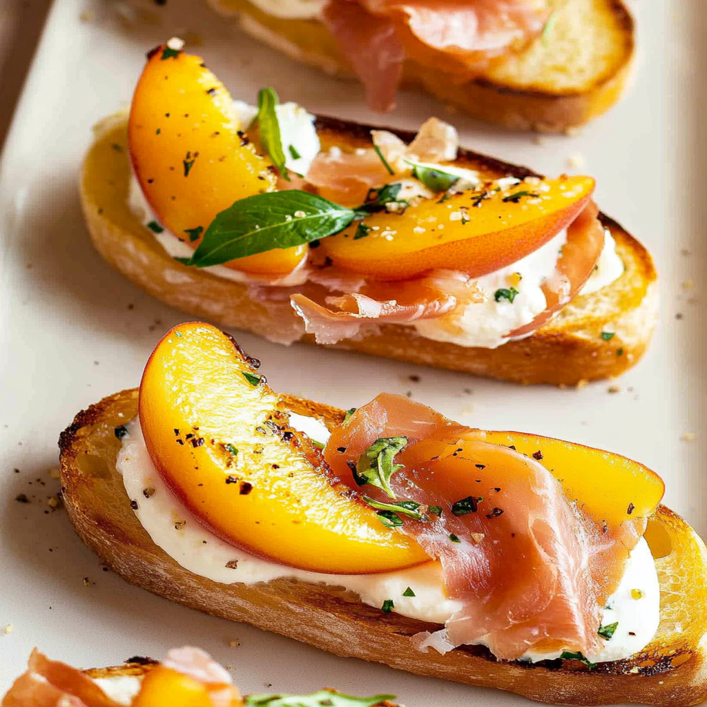 Start by toasting the bread until golden brown. While the bread cools, slice the peaches and prosciutto. Assemble each piece of toast with a layer of creamy cheese, followed by peaches, prosciutto, and a drizzle of balsamic glaze for the perfect bite.