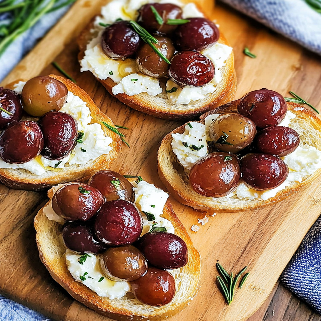 Once everything is ready, spread a generous layer of whipped feta on each toasted slice of baguette. Top it off with those glorious roasted grapes. Serve immediately while still warm for that perfect melty experience!